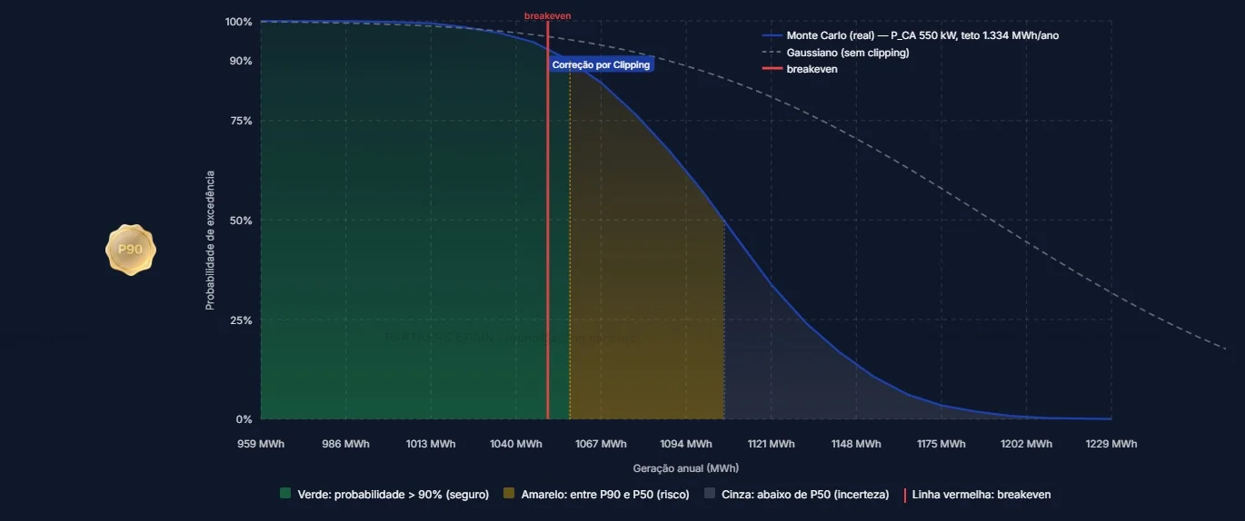 O calculo de P90 envolve o cruzamento de dezenas de variaveis interdependentes: series historicas de irradiacao solar (minimo 10 anos de dados de fontes reconhecidas como SolarGIS e Meteonorm), variabilidade interanual especifica da regiao (que no Brasil varia de 3% a 7% de desvio padrao), modelagem completa de perdas do sistema (temperatura, sombreamento, sujeira, degradacao, inversores, cabeamento) e distribuicao probabilistica para extrair os percentis de geracao.