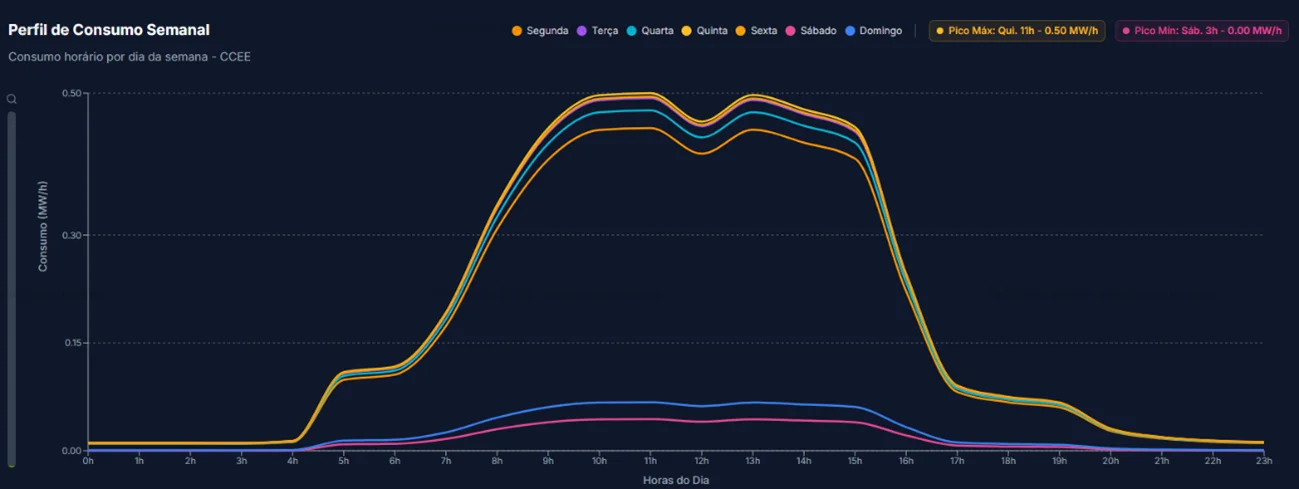 Diferente do que muitos pensam, gerar a própria energia "atrás do medidor" (behind-the-meter) no ACL traz uma previsibilidade de custo que contratos de longo prazo nem sempre conseguem garantir sozinhos. Como podemos observar no gráfico abaixo, o consumo desta planta é extremamente aderente à geração solar durante os dias úteis.